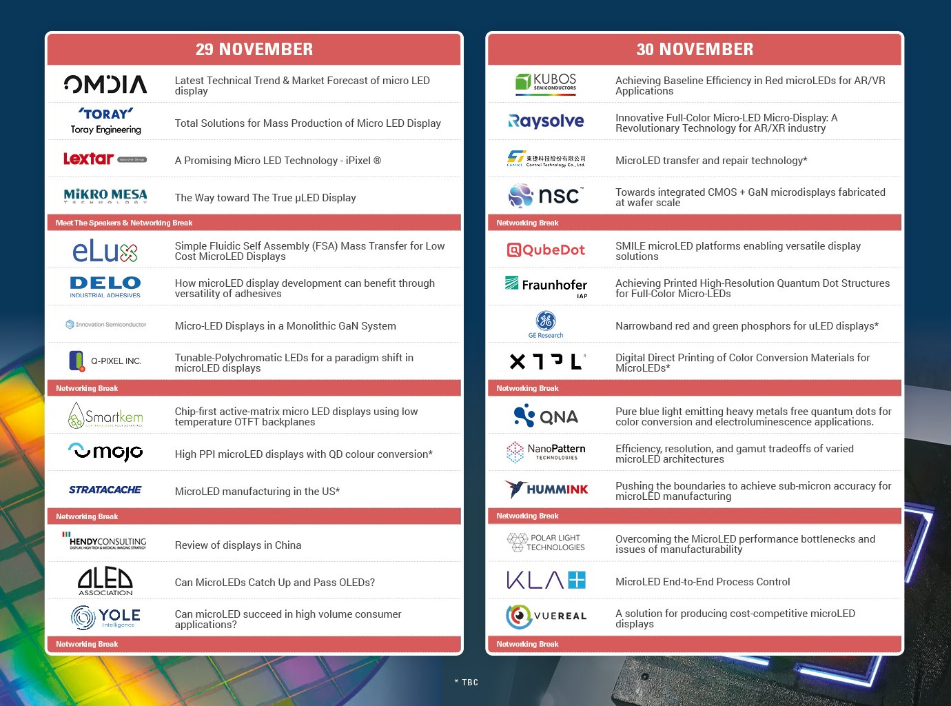 The event will highlight the full spectrum of technological, application and market developments in the field, covering all aspects including market analysis, GaN on Si, LIFT, EHD Printing, Innovative Transfer, Color Conversion, Manufacturing, Repair, Inspection, Drivers, Wearables, AR/VR/MR, and much more. The event brings together all the key players - from OEMs to start-ups from around the world.