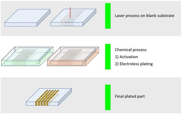 ultrashort pulse laser selectively alters the substrate’s surface, introducing microscale structural and chemical changes. These modified regions are then subjected to catalytic activation by immersion in a metal precursor solution, which binds selectively to the laser-processed areas. Finally, an electroless plating process deposits a uniform copper layer only on the activated regions, resulting in precise and conductive traces. With its combination of resolution, speed, and simplicity, SSAIL