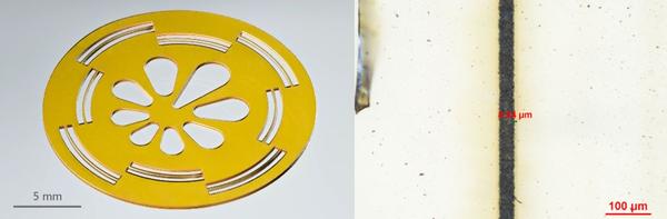 Figure 5. Processing of polyimide with femtosecond laser operating at wavelength of 515 nm. Femtosecond lasers also excel in metal micromachining, offering burr-free edges and negligible heat-affected zones. This enables the production of intricate metal parts without the need for secondary operations. We’ve successfully demonstrated processing on stainless steel,