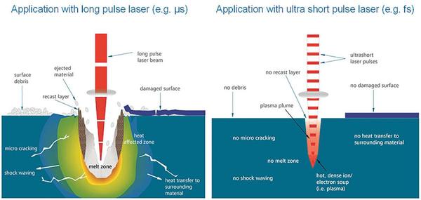 Figure 2. Schematic of material processing with long and ultrashort pulse lasers. Courtesy of Amada Miyachi America Inc.