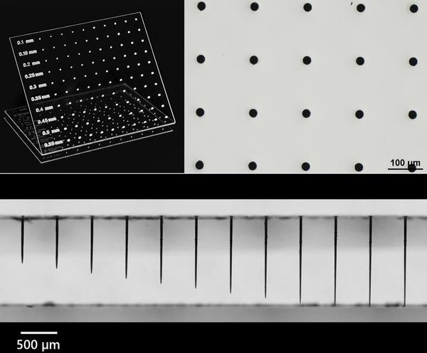 Figure 4. TGV fabrication. (left) Selective laser etching of TGV, courtesy of WOP. (right, bottom) Percussion drilling of TGV, courtesy of Akoneer.
