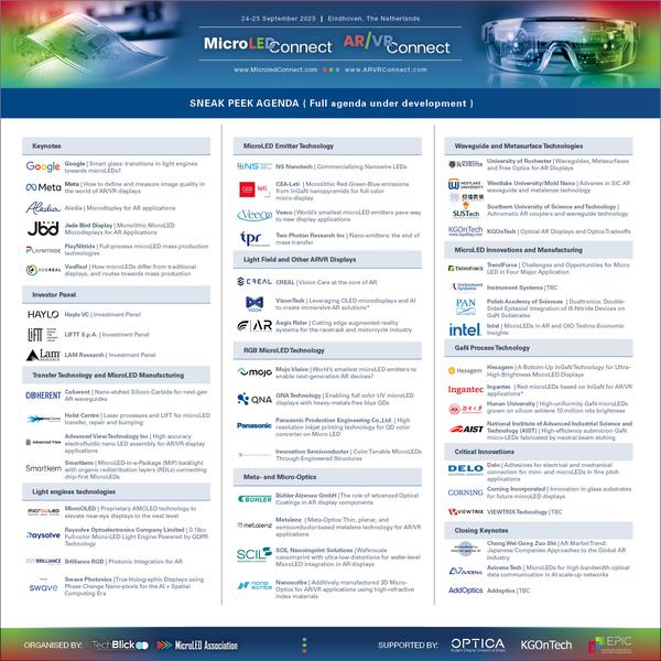 The exhibition floor is selling out rapidly (only a single spot left). Do NOT miss the opportunity to showcase your technology at the most important event worldwide dedicated exclusively to microLED and AR/VR display technologies. Laser sharp focus on these topics is critical in reaching and engaging with the right audience. Explore the exhibition floor here.